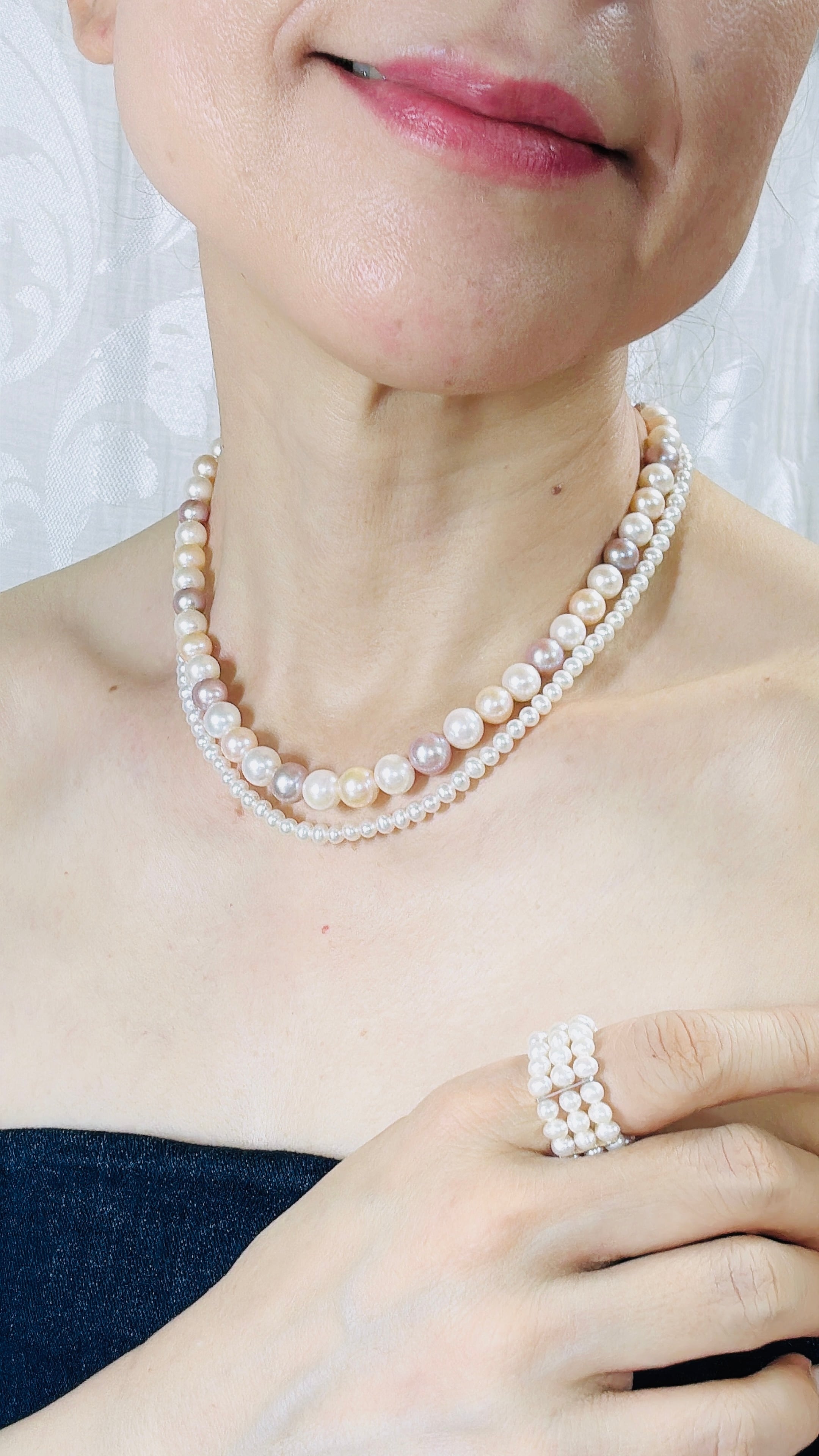 テリも美しい大玉8-9.5mmをホワイト、オレンジ、ピンク、ラベンダーでマルチカラーでお仕立て。