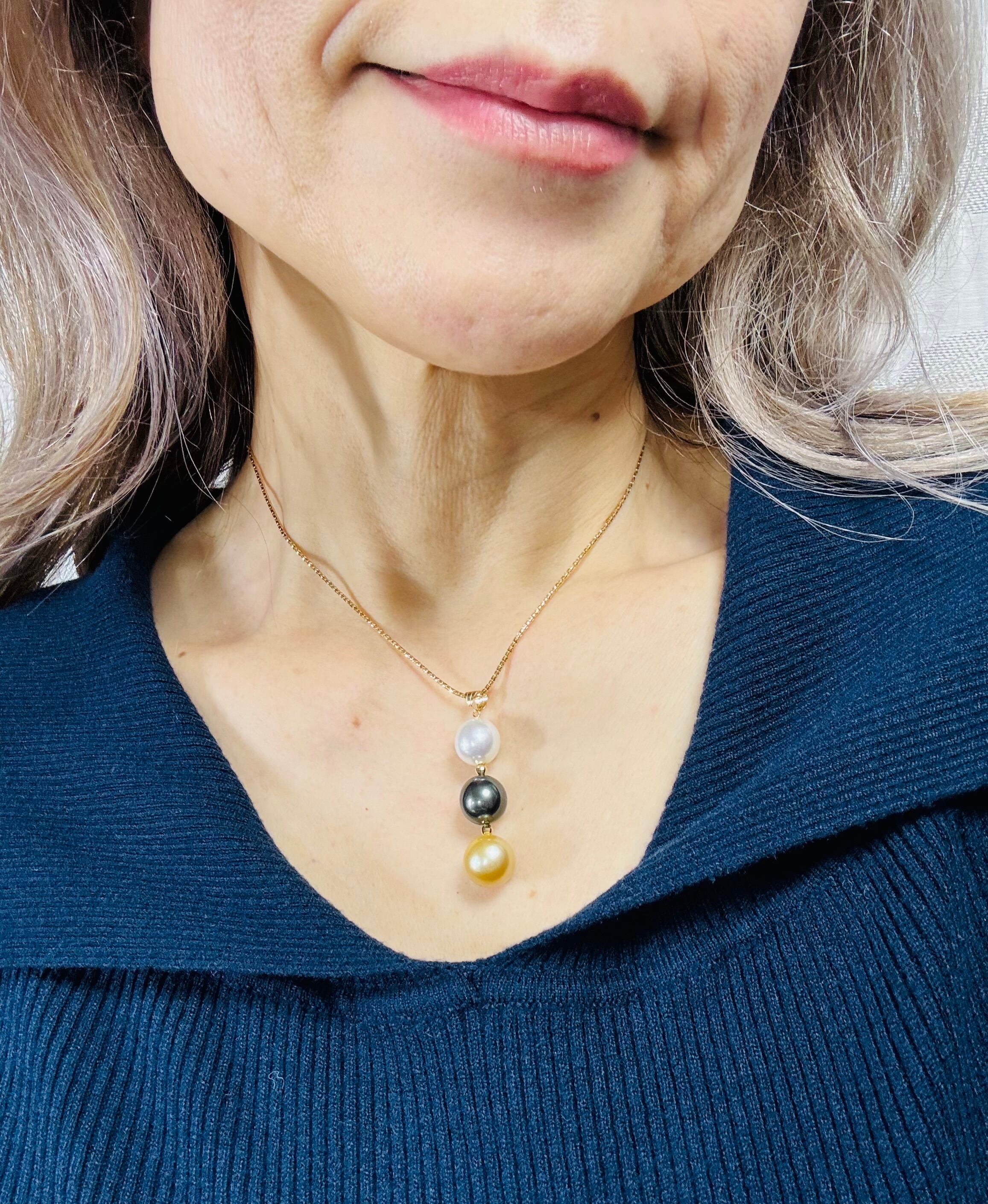 南洋真珠のマルチカラーを配したスリーパールは贅沢仕様。