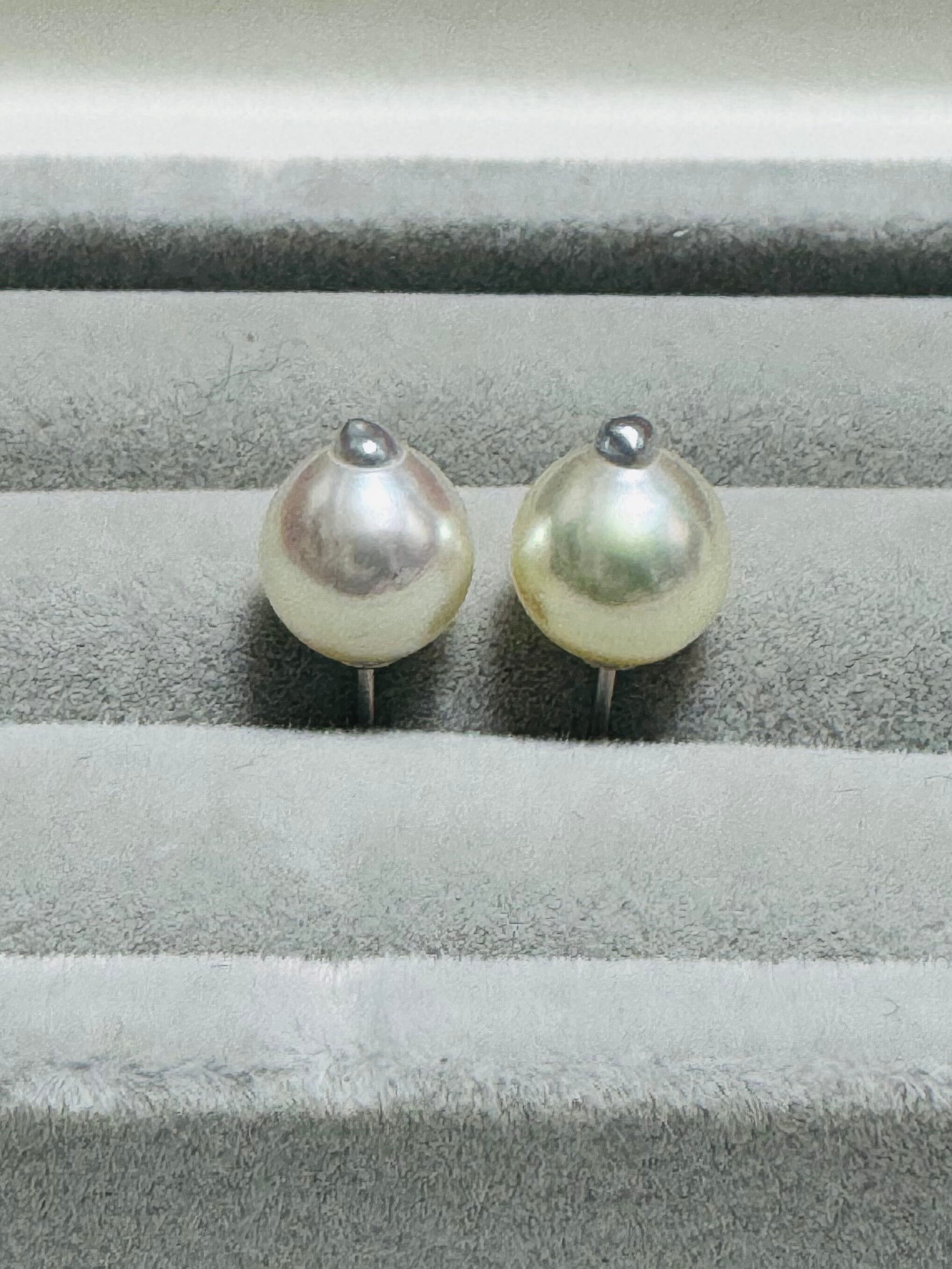 他にもポッチがついたアコヤ真珠がありましたが、ポッチの大きさも様々。ただほとんどがホワイトカラーでしたが、この2個の身が青い!ボディカラーが少しだけ違いますが、ポッチ合わせでペアにしました。